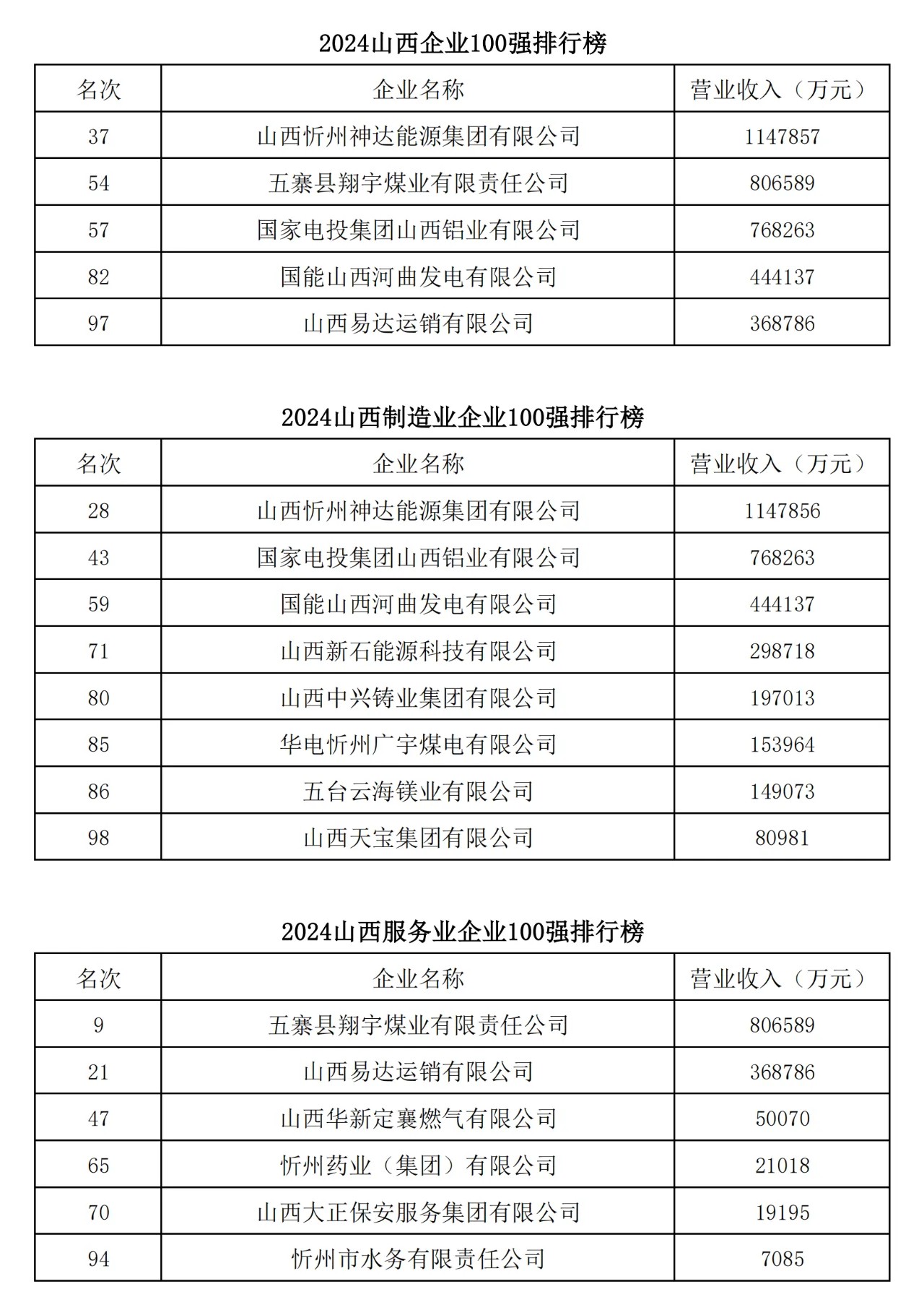 今年是山西省企業(yè)聯(lián)合會、山西省企業(yè)家協(xié)會連續(xù)第二十一年向社會發(fā)布“山西企業(yè)100強排行榜”,同時發(fā)布《山西企業(yè)100強(年度)發(fā)展報告》。2024山西企業(yè)100強營業(yè)收入總額26041.18億元,比上年略有降低;入圍門檻35.8億元,比上年增加了5.32億元,平均資產(chǎn)總額比上年增加了17.63%,平均凈利潤比上年增長了0.49%。晉能控股集團有限公司以營業(yè)收入4505.2億元排名第一;山西焦煤集團有限責任公司以營業(yè)收入2373.89億元排名第二;潞安化工集團有限公司以營業(yè)收入1730億元排名第三。2024年山西省百強企業(yè)中有2家企業(yè)躋身世界企業(yè)500強;有10家企業(yè)入圍中國企業(yè)500強;有5家企業(yè)入圍中國制造業(yè)企業(yè)500強;有3家企業(yè)入圍中國服務(wù)業(yè)企業(yè)500強。