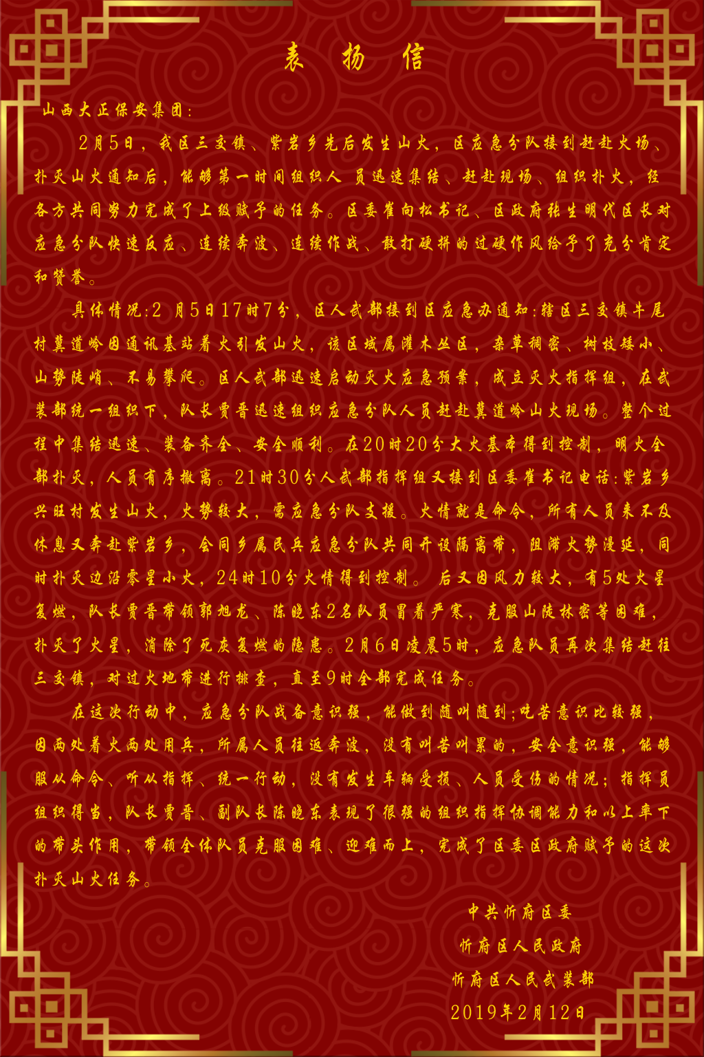 另外,2月5日,忻府區(qū)三交鎮(zhèn)、紫巖鄉(xiāng)先后發(fā)生山火,區(qū)應(yīng)急分隊接到趕赴火場、撲滅山火通知后,公司在第一時間組織應(yīng)急人員迅速集結(jié)、趕赴現(xiàn)場、組織撲火,全體隊員攻堅克難、英勇奮戰(zhàn)、連續(xù)奔波、連續(xù)作戰(zhàn),經(jīng)各方共同努力圓滿完成了上級賦予的滅火任務(wù),得到了忻府區(qū)委崔向松書記、張生明代區(qū)長的充分肯定和贊譽。此外,中共忻府區(qū)委,忻府區(qū)人民政府,忻府區(qū)人民武裝部專程來公司送來表揚信,對公司應(yīng)急隊伍完成此次救火任務(wù),展示了公司隊伍良好形象進(jìn)行了表揚。