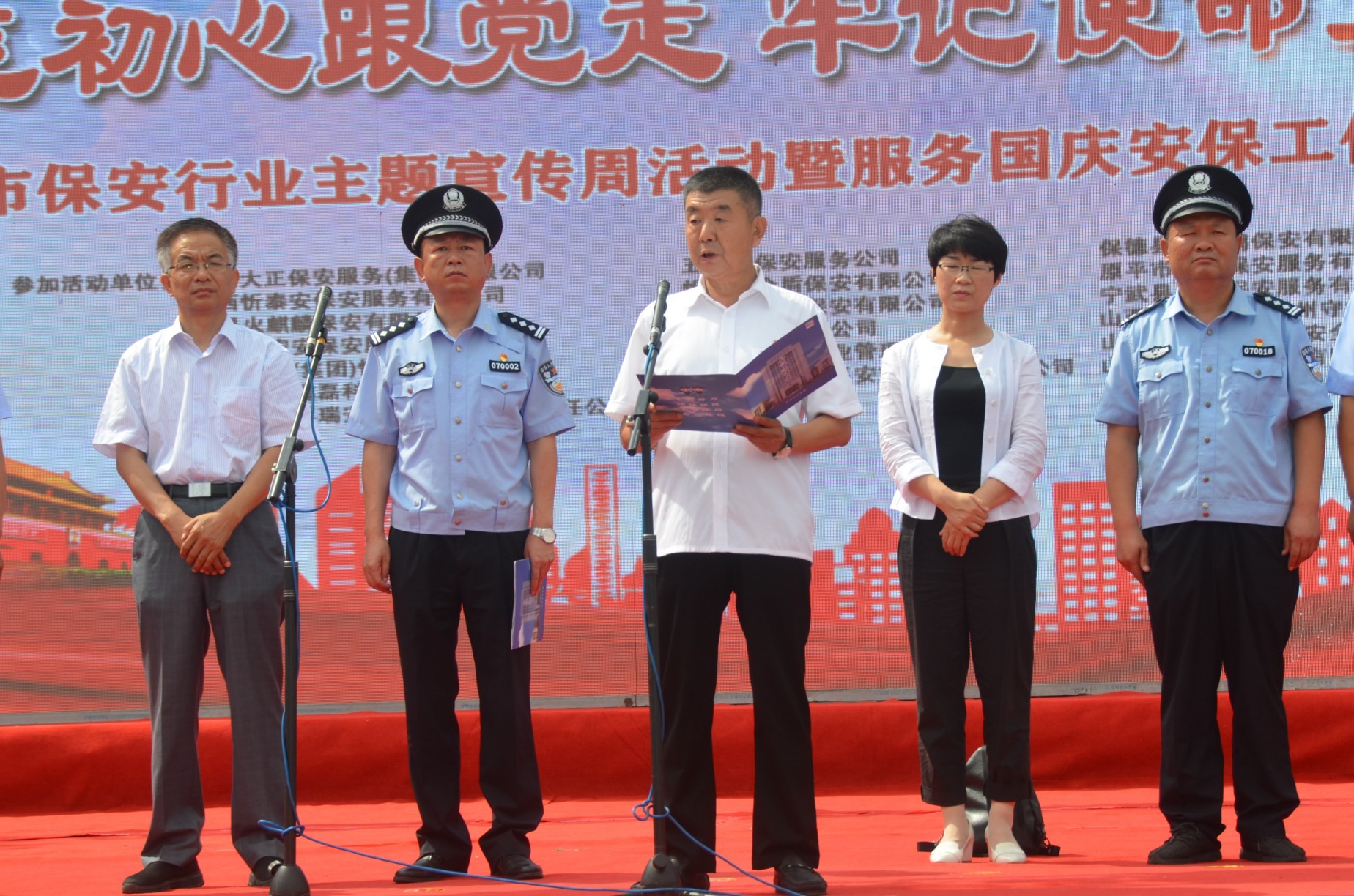 市總工會(huì)常務(wù)副主席王書鴻,市婦聯(lián)辦公室主任王軼男,市人社局保險(xiǎn)科科長溫秀偉,市公安局治安支隊(duì)負(fù)責(zé)人王新策,市公安局直屬分局局長楊德華,市公安局忻府分局局長張鵬,市公安局直屬分局副局長劉建強(qiáng)出席儀式。市保安協(xié)會(huì)副會(huì)長、山西大正保安服務(wù)有限公司黨委委員、副總經(jīng)理趙培宏主持儀式并宣布主題宣傳周活動(dòng)正式啟動(dòng)。市保安協(xié)會(huì)副會(huì)長、山西大正保安服務(wù)有限公司黨委委員、副總經(jīng)理王明生出席儀式并宣讀主題宣傳周活動(dòng)實(shí)施方案。全市18家保安企業(yè)負(fù)責(zé)人、保安隊(duì)員代表500余人參加儀式。在忻參加全省守押行業(yè)素質(zhì)提升在崗輪訓(xùn)的各地市守押企業(yè)隊(duì)員100余人應(yīng)邀參加儀式。