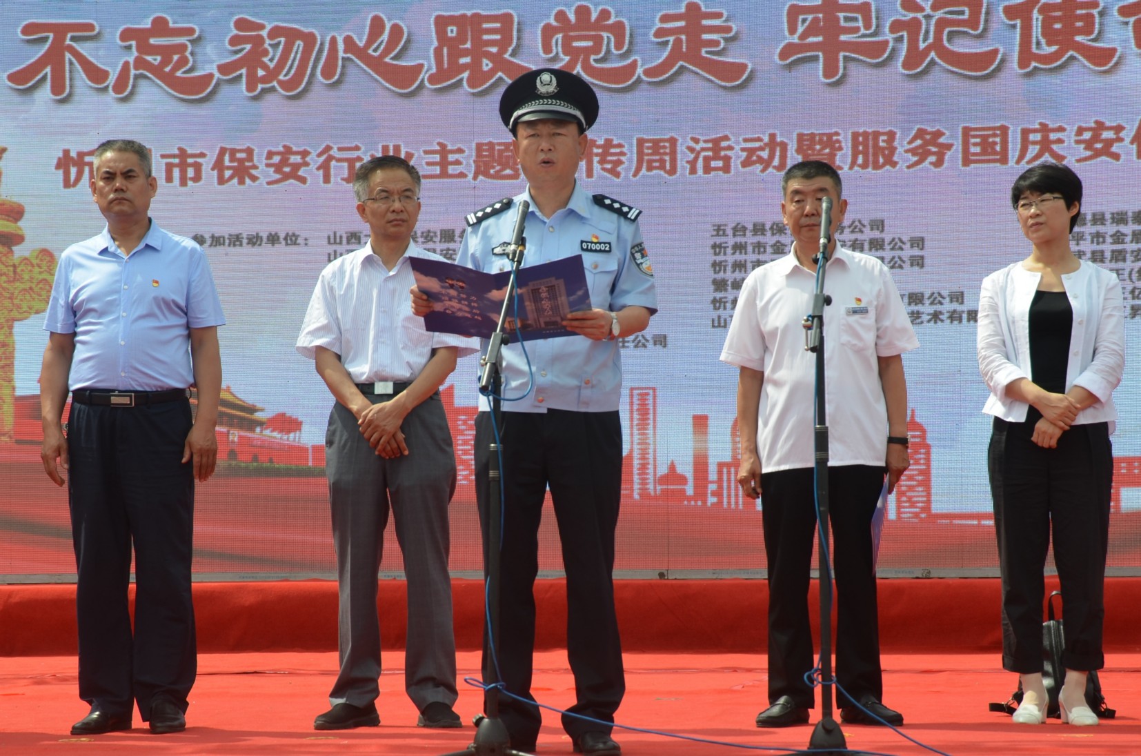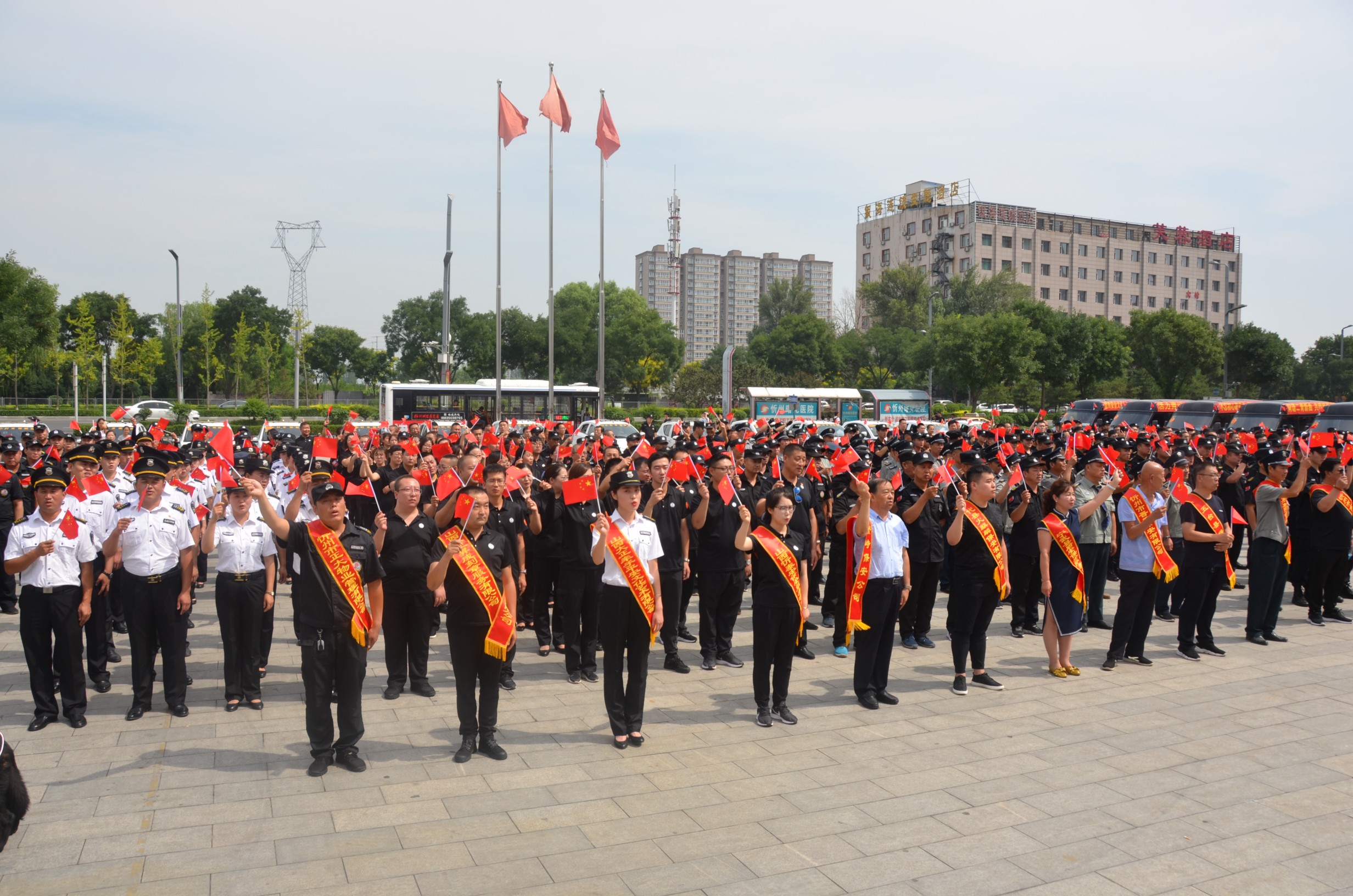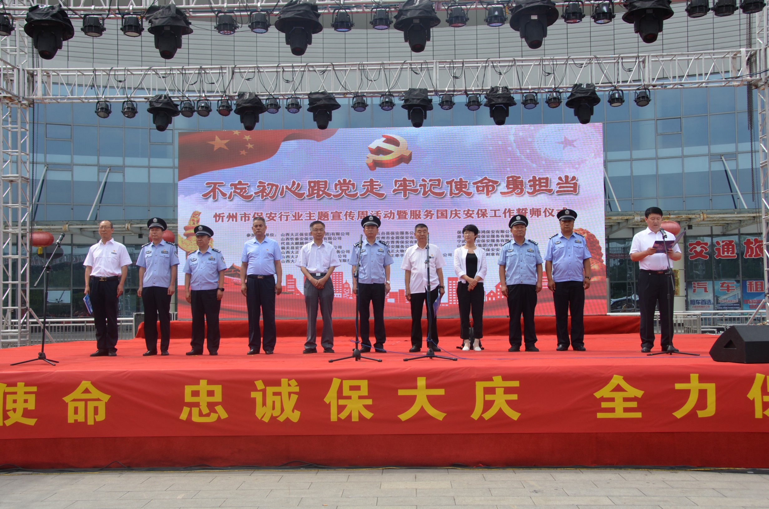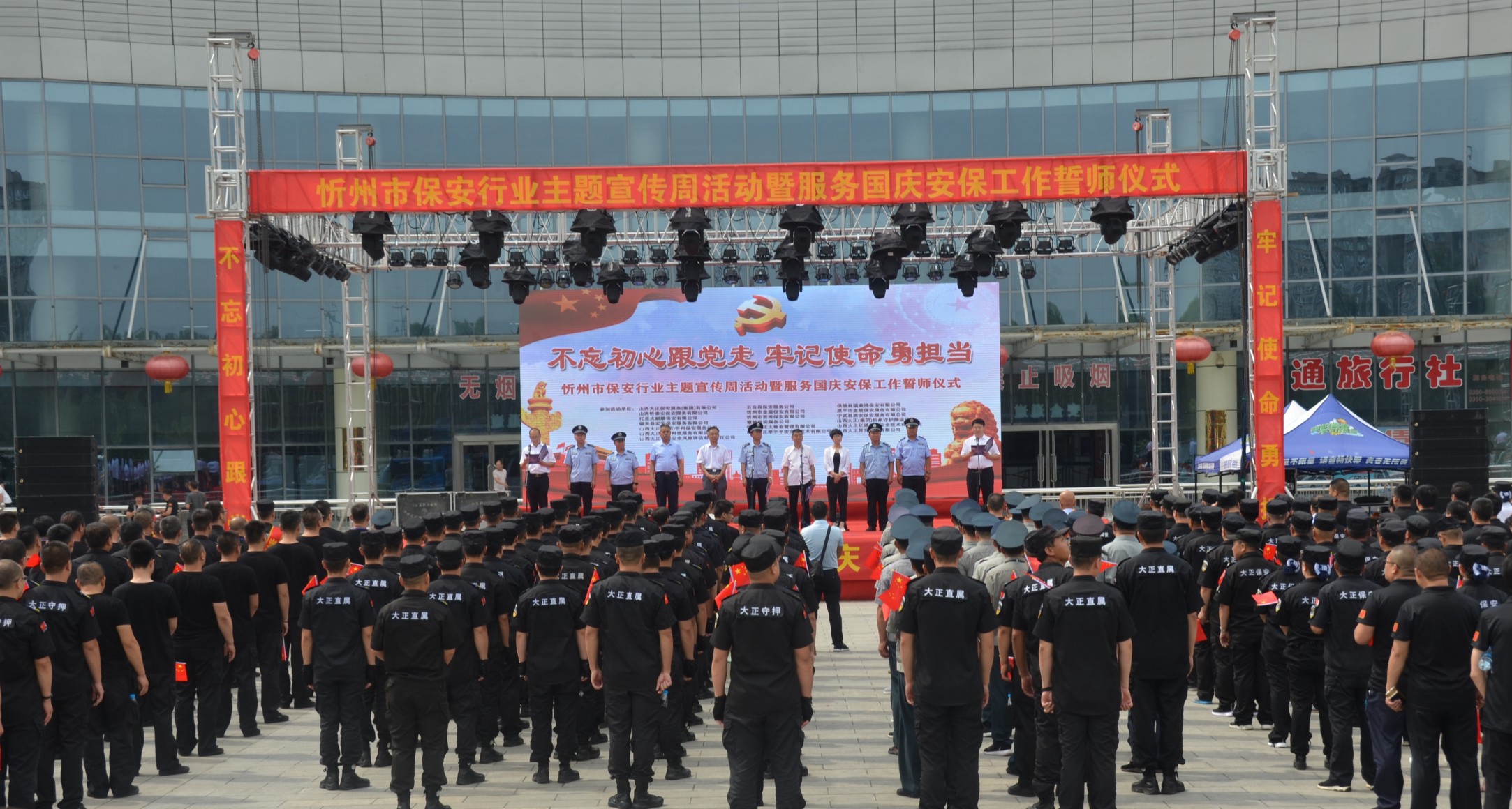 7月24日,忻州市公安局、忻州市保安協(xié)會(huì)會(huì)同山西大正保安服務(wù)有限公司、忻州市公安局直屬分局、忻州市公安局忻府分局及全市18家保安企業(yè)在忻州市客運(yùn)中心與全國各地同步舉行保安行業(yè)“不忘初心跟黨走、牢記使命勇?lián)?dāng)”主題宣傳周活動(dòng)暨服務(wù)國慶安保工作誓師儀式。