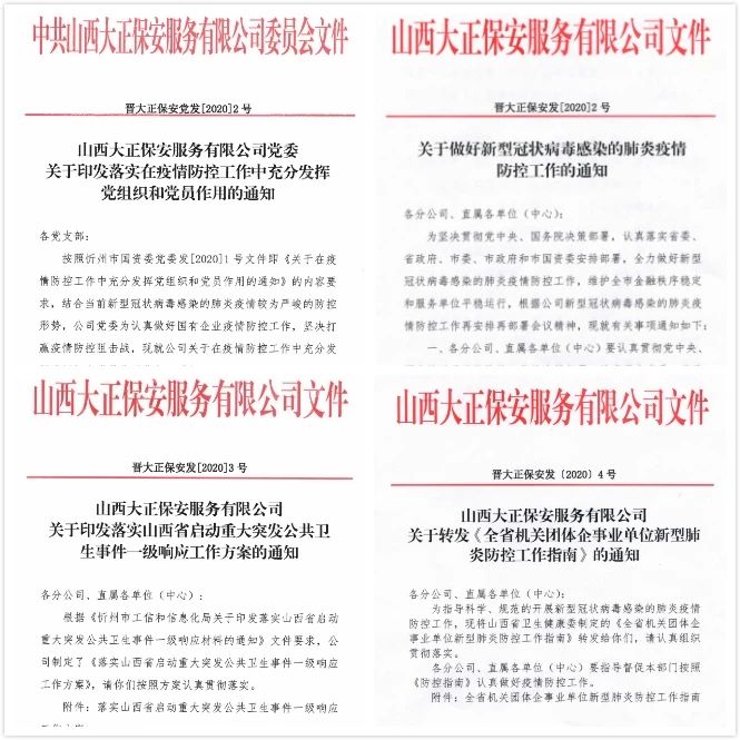 為深入貫徹習近平總書記對新型冠狀病毒感染肺炎疫情防控工作的重要指示精神,堅決落實黨中央重大決策部署及省委、市委、市國資委部署安排,山西大正保安服務(集團)有限公司印發(fā)《關于做好新型冠狀病毒感染的肺炎疫情防控工作的通知》、《山西大正保安服務有限公司關于印發(fā)落實山西省啟動重大突發(fā)公共衛(wèi)生事件一級響應工作方案的通知》,要求公司各部門把防控疫情作為當前最重要的工作來抓,落實落細防控措施,切實保障員工安全,保障全市金融秩序穩(wěn)定和服務單位平穩(wěn)運行。集團公司黨委印發(fā)了落實在疫情防控工作中充分發(fā)揮黨組織和黨員作用的通知,要求基層黨支部、全體黨員深刻認識疫情防控形勢,全面落實我市“五嚴五防”措施,用實際行動踐行初心使命。