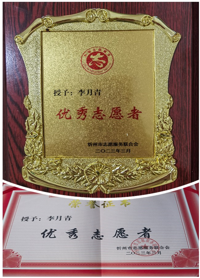 山西大正集團公司李月青榮獲忻州市志愿服務聯合會2022年度“優(yōu)秀志愿者”榮譽稱號,并作為志愿者團隊代表發(fā)言。