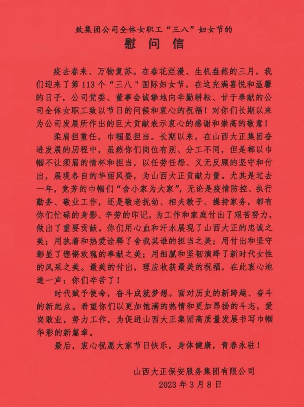 在第113個(gè)國(guó)際婦女節(jié)也是我國(guó)第100個(gè)婦女節(jié)到來之際,山西大正保安服務(wù)集團(tuán)有限公司向公司所有女同胞們致以節(jié)日的問候和美好的祝愿!向所有辛勤耕耘、默默奉獻(xiàn)在大正各個(gè)崗位上的姐妹們表示親切的問候、崇高的敬意!