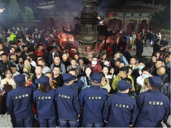 凌晨0點過后,車流量、人流量逐步增多,還愿、許愿香客絡繹不絕,執(zhí)勤隊員一邊要維持秩序,一邊還要檢查是否攜帶香火蠟燭燈等易燃物品進入寺廟。凌晨0時直到次日中午12時在長達 24個小時的時間里,公司帶隊領導和隊員們始終堅守在一線,充分體現(xiàn)了大正保安人紀律嚴明、吃苦耐勞、能打硬仗、團結一致的優(yōu)良作風。執(zhí)勤中,全體保安隊員堅守崗位、履職盡責、文明執(zhí)勤,維持秩序、服務群眾,營造了安全祥和的氣氛,圓滿完成了此次廟會安;顒樱故玖藝蟊0矊I(yè)水準和良好的精神風貌。