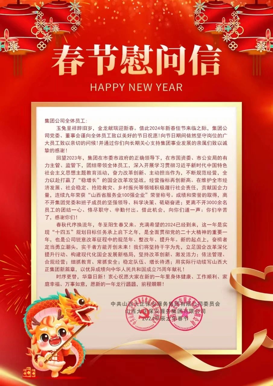 玉兔呈祥辭舊歲,金龍獻(xiàn)瑞迎新春。值此2024年新春佳節(jié)來(lái)臨之際,集團(tuán)公司黨委、董事會(huì)謹(jǐn)向全體員工致以美好的節(jié)日祝愿!向節(jié)日期間依然堅(jiān)守崗位的廣大員工致以親切的問(wèn)候!并通過(guò)你們向長(zhǎng)期關(guān)心支持集團(tuán)事業(yè)發(fā)展的親屬們致以誠(chéng)摯的感謝!
