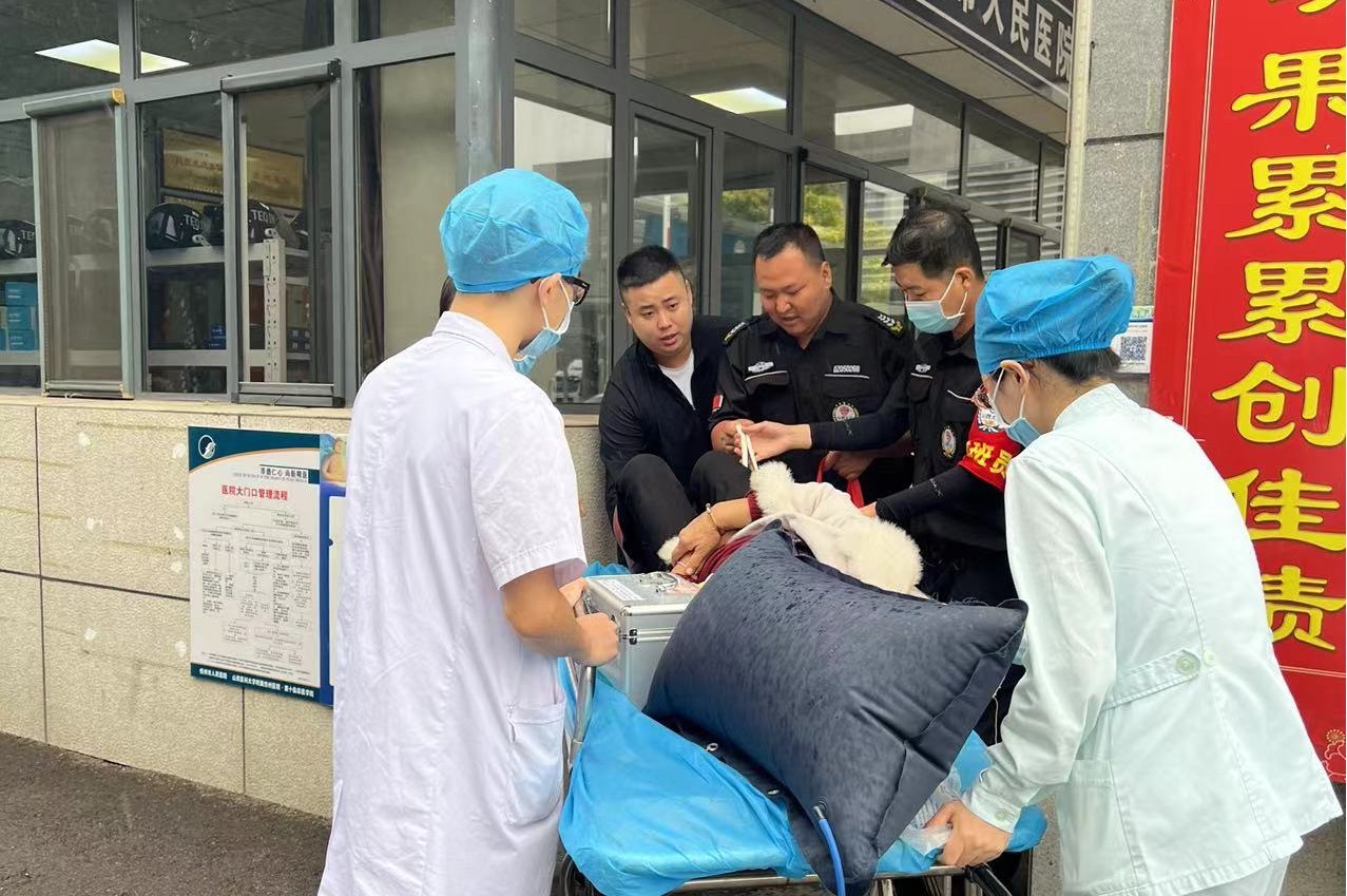 9月19日上午,伴隨著紛紛細(xì)雨,保安直屬公司市醫(yī)院駐勤中隊(duì)和往常一樣繁忙的一天開(kāi)始了。9時(shí)許,西門(mén)人行通道正常查驗(yàn)場(chǎng)所碼過(guò)程中,一名中老年婦女只身一人手拎兩個(gè)包步履蹣跚顫顫巍巍走上前來(lái),正在執(zhí)勤的兩名女隊(duì)員發(fā)現(xiàn)后急忙上前攙扶詢(xún)問(wèn)是否需要幫助,話語(yǔ)間,老婦手里的包突然掉落地上,癱倒在女隊(duì)員身邊。在隊(duì)長(zhǎng)得知消息后,協(xié)同兩名男隊(duì)員即刻前往急診中心尋求醫(yī)生和擔(dān)架,待醫(yī)生到達(dá)過(guò)程中,老婦一直嘴上喊心口疼,并且頭昏,不時(shí)有嘔吐癥狀,一邊嘴上哭訴子女無(wú)人陪伴就醫(yī),兩名女隊(duì)員則在其身旁細(xì)心安撫情緒,告知醫(yī)生和擔(dān)架馬上過(guò)來(lái)。幾分鐘內(nèi)兩名男隊(duì)員和兩名醫(yī)生推著擔(dān)架車(chē)一路飛奔急忙趕來(lái),醫(yī)生詢(xún)問(wèn)后,兩名男隊(duì)員將婦女抬上擔(dān)架車(chē),送至急診搶救。